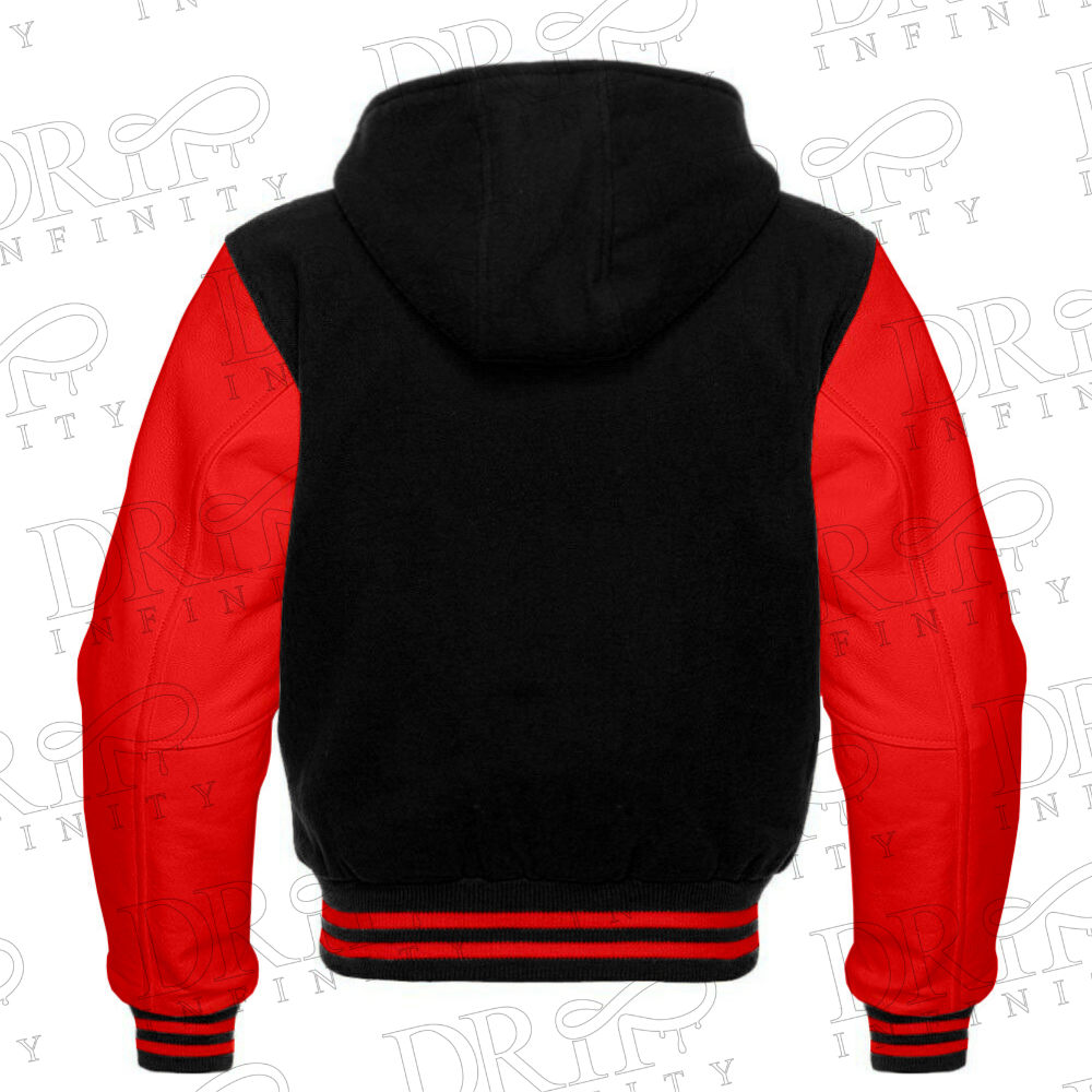 DRIP INFINITY: Men’s Black & Red Hooded Varsity Jacket