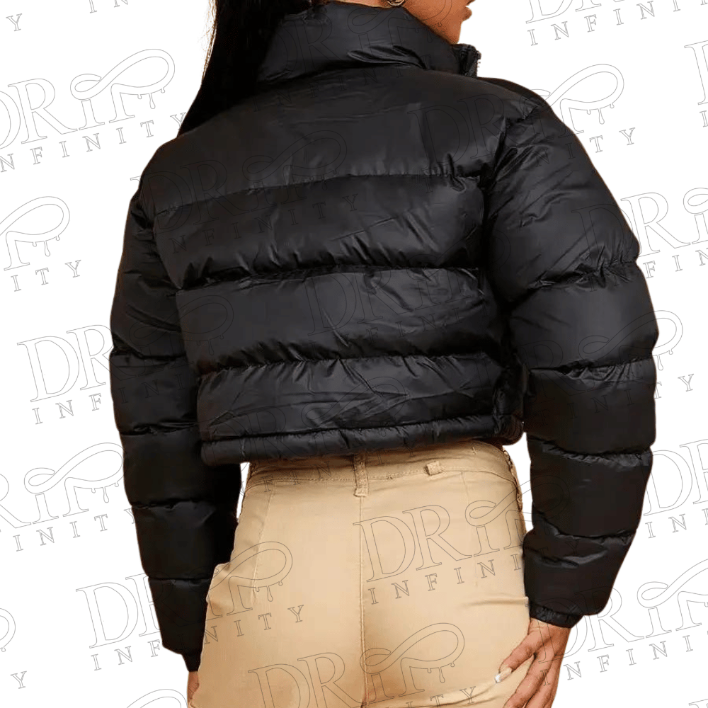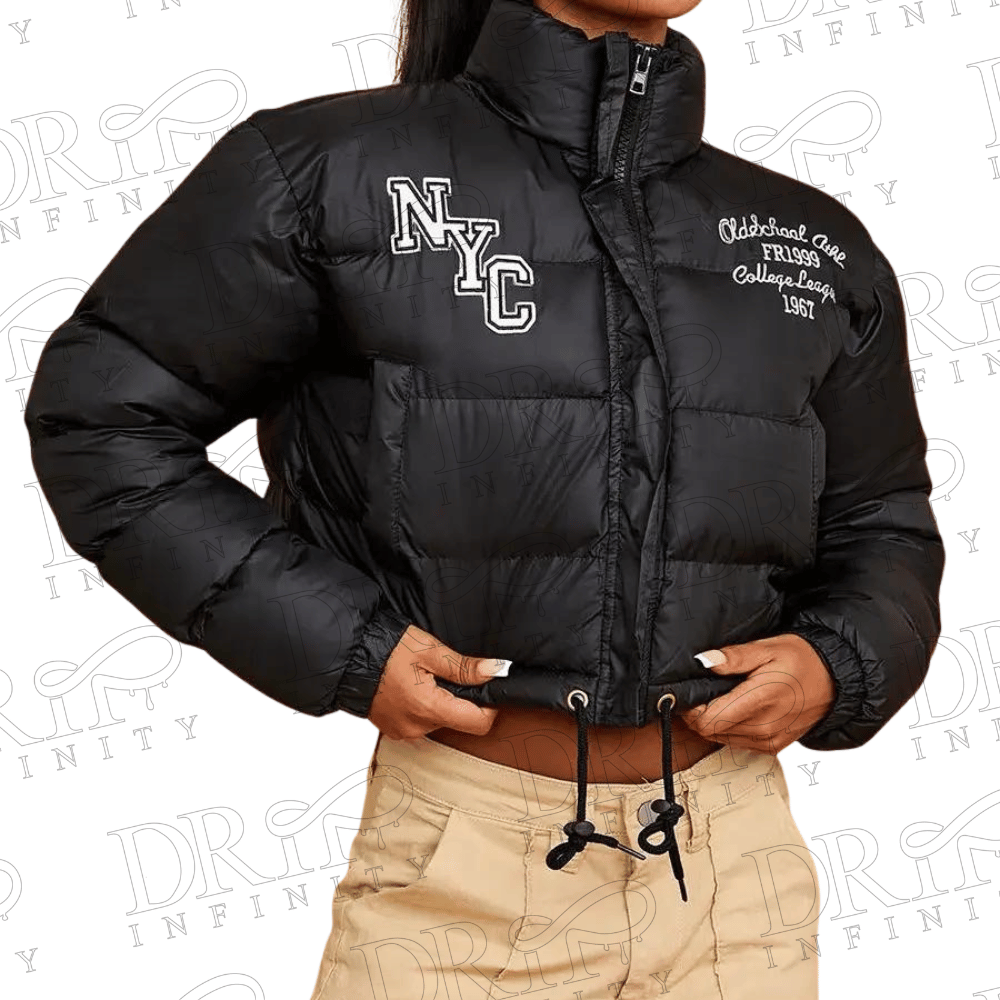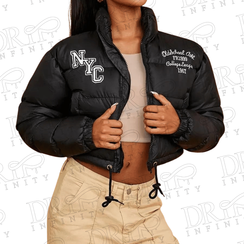 DRIP INFINITY: Women’s Black Cropped NYC Logo Puffer Jacket