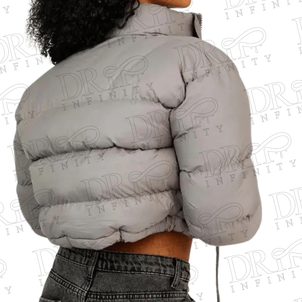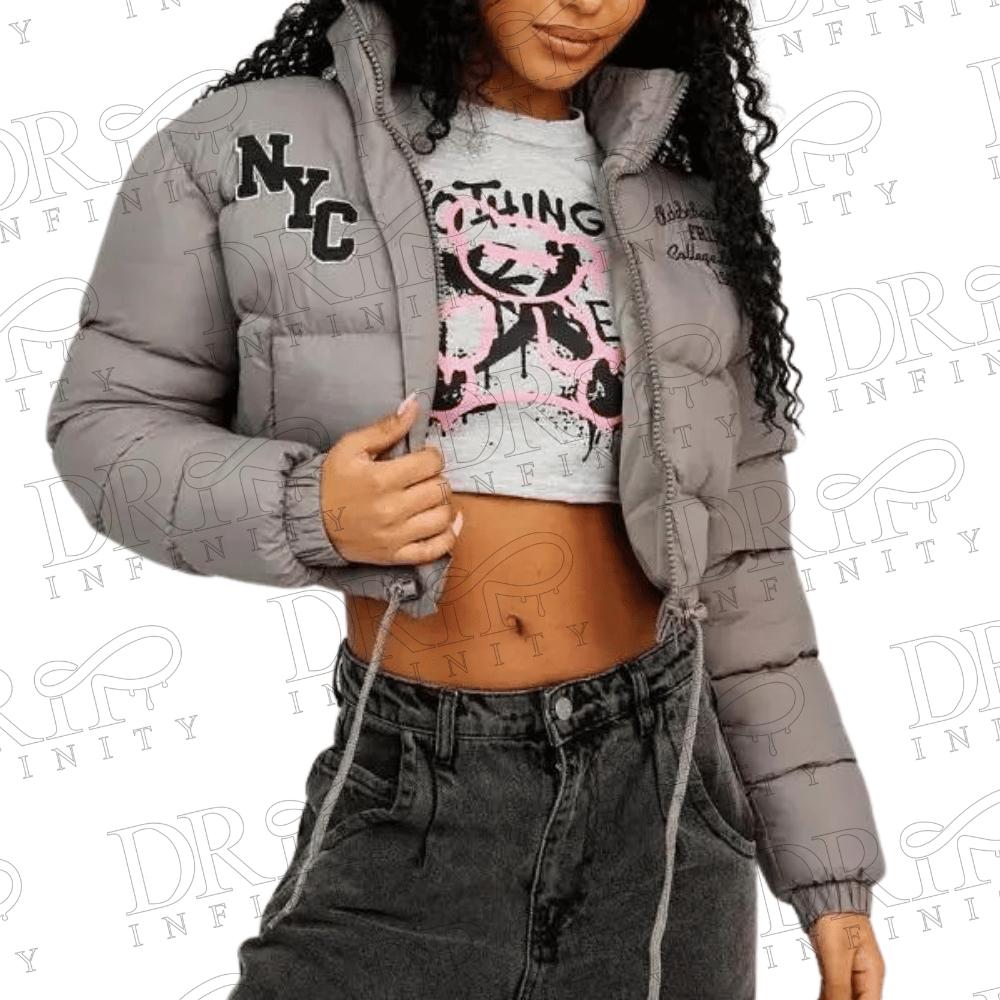 DRIP INFINITY: Women’s Grey Cropped NYC Logo Puffer Jacket